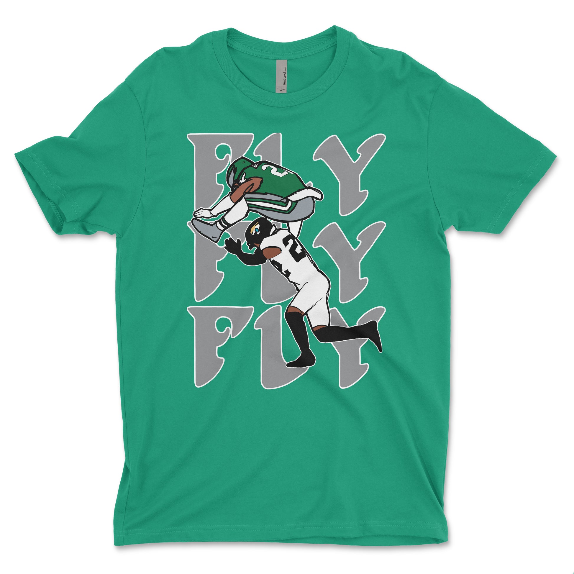 Showcase your support for the newest addition to the Eagles with the "Fly Saquon" tee. Featuring a dynamic graphic from when he defied gravity with a backwards hurdle against the Jaguars. It shocked NFL fans across the globe and even caused league offices to drug test him following the game.